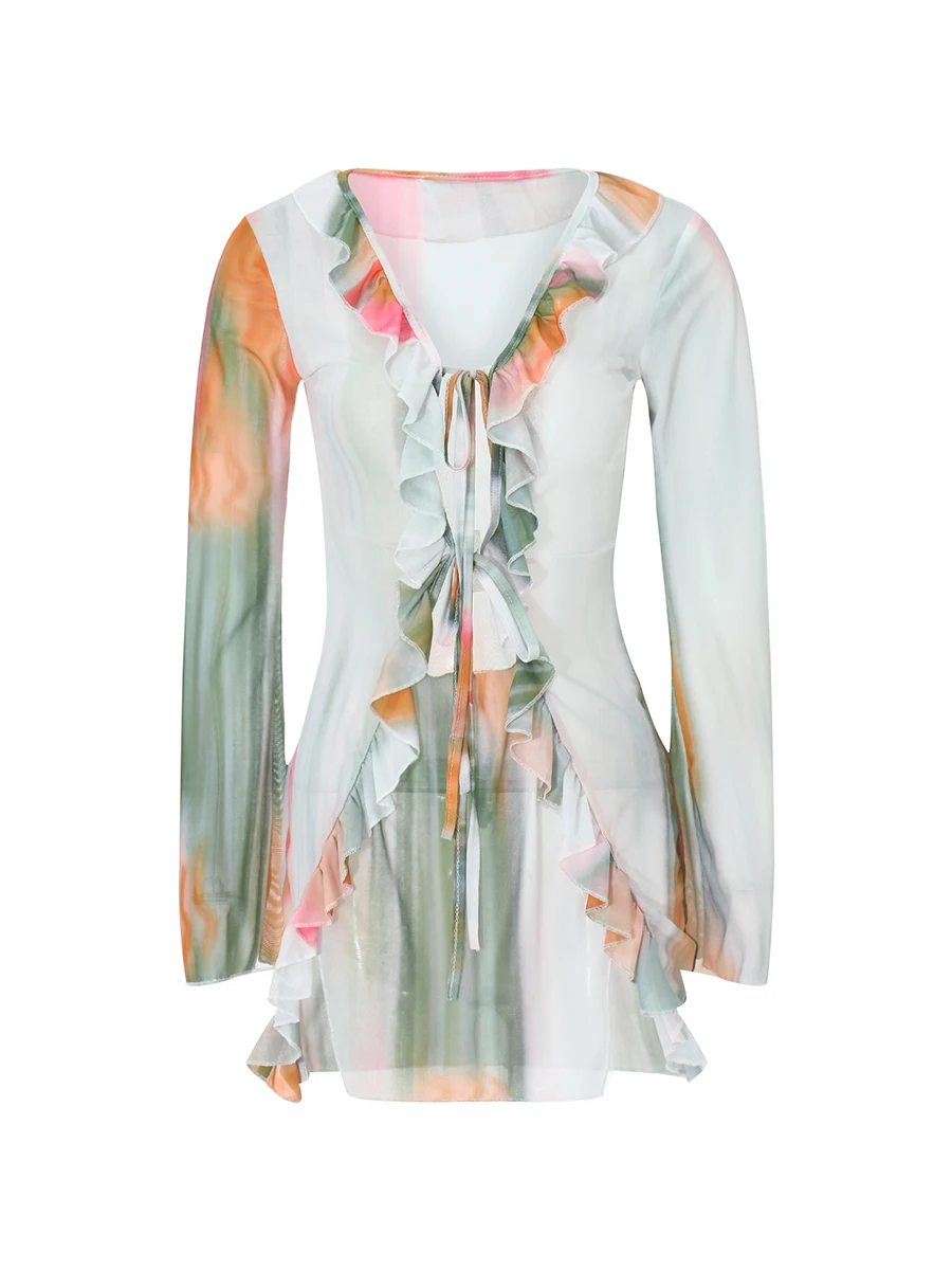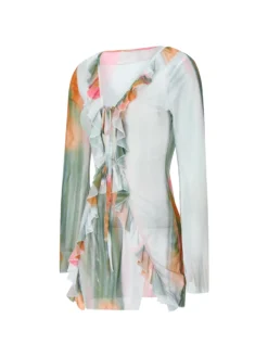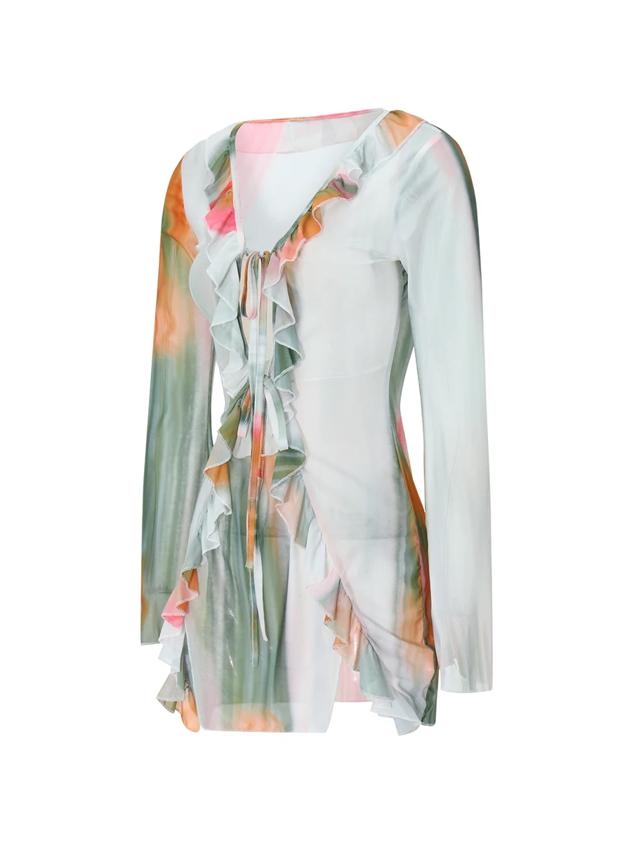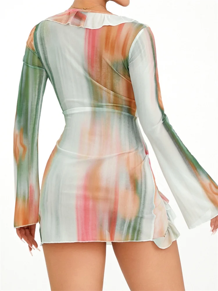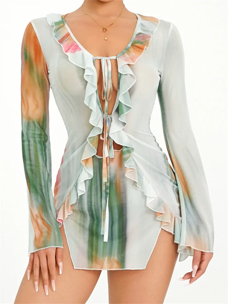 Women Summer Fall Dress Long Sleeve Flounce V Neck Tie-up Mini Dress Party Club Beach Sexy Y2K Dresses